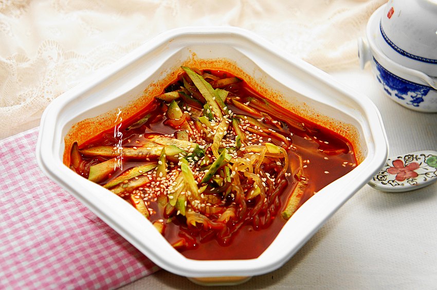 北方人还是感觉太辣,又特别想吃,没关系,教你一招,取一根黄瓜去皮洗净切丝,这样一拌就OK啦,吃得真过瘾啊!