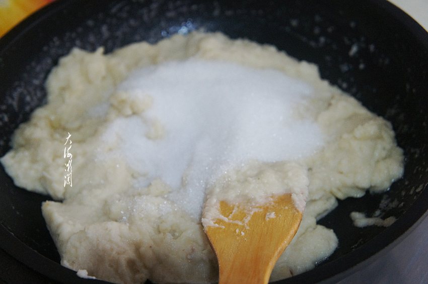 炒至莲蓉变得黏稠时,加入白砂糖,喜欢的还可以加入适量的麦芽糖,我没加,所以做出来的是白色的。