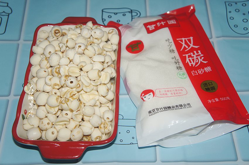 网购的无心莲子。取250g倒入碗中,加水浸泡至变软(大约三四个小时左右),然后清理一下,很多莲子上都带有莲子皮,有的的莲子还有莲子心,取出莲子心,再用流动的水多清洗几遍。白糖我选用的是白砂糖。