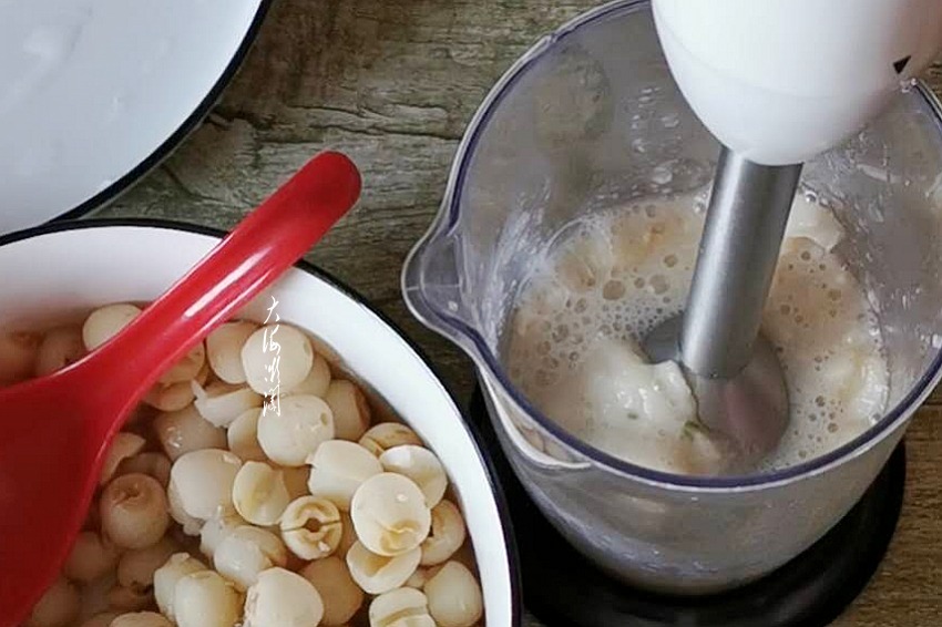将煮好的莲子放入料理机中,打成细腻的糊状,如果搅拌机搅不动可以适当加点莲子汤或者凉开水,能够让搅拌机启动就可以,不需要加很多水,否则炒制时间会加长。