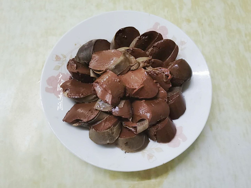 第四道菜:猪血肠。这道菜是东北人的大爱,口感嫩滑,像吃鸡蛋羹一样,味道极其鲜美。这算是一道半成品菜,买回来的猪血肠在锅中稍微煮几分钟就好,别煮过了,煮老了就不好吃了,蘸蒜泥吃别有风味。