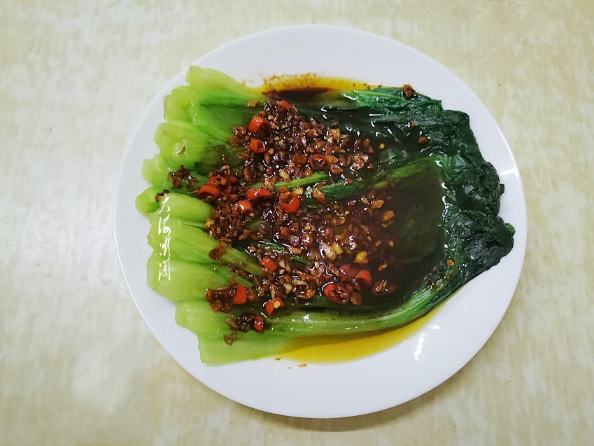 第七道菜:蒜蓉小油菜。这是一道快手菜,蒜香浓郁,爽口开胃,下酒下饭菜。秋天多吃点油菜有好处,油菜中含有大量的植物纤维素,能促进肠道蠕动,能与脂类结合,从而排除体内垃圾。而且油菜含有大量胡萝卜素和维生素C,有助于增强机体免疫能力。油菜所含钙量在绿叶蔬菜中为最高,常食对孩子长身体有利。油菜掰开后清洗干净,大蒜切碎。锅内入水烧沸,下入小油菜快速焯熟。沥干水分,盐,生抽,鲜鸡汁、淀粉,少许水调匀。热锅凉油少许,下入蒜末、小米椒炒香,下入碗汁,大火收汁,芡汁浓稠即可,浇在油菜上就OK了,非常简单。