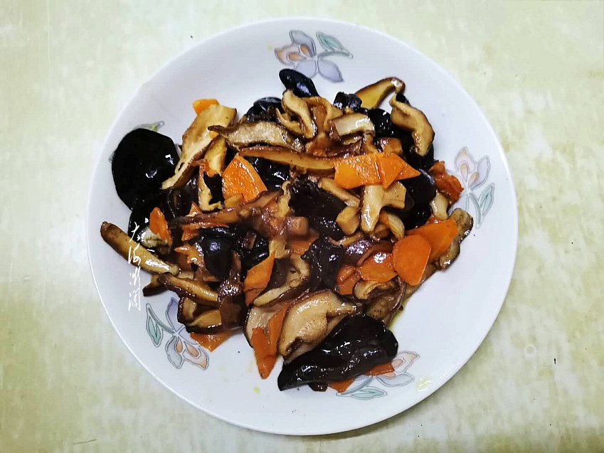 第八道菜:素炒香菇。香菇加点胡萝卜一起炒,口感滑嫩,香味浓郁,肉质厚实,素炒比肉都香,而且营养价值高,具有高蛋白、低脂肪、多糖、多种氨基酸和多种维生素,常食能提高机体免疫力,还能美容养颜。