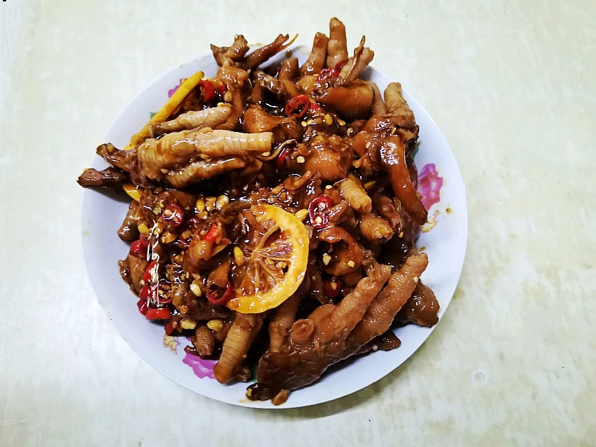 第五道菜:柠檬酸辣凤爪,一道网红菜,是小朋友最喜爱的一道菜,每次做2斤凤爪,一两天就吃光。柠檬搭配鸡爪,色香味的完美结合,可以让鸡爪达到美味无比的效果,使得鸡爪吃起来回味无穷,当菜当零食都是超级美味。做法也不难,鸡爪煮熟冲凉,脱去主骨,斩成块,装入容器,将盐、红糖、生抽、醋、料酒、辣椒、小米椒圈、蒜末拌到一起,加入鸡爪中,分量根据个人爱好及鸡爪的份量来定。倒入矿泉水,没过鸡爪即可。然后加入香油搅拌,放入切好的柠檬片,喜欢吃香菜的也可以放。将盒子密封好,放入冰箱,中间拿出来搅拌两三次,静等6小时以上就可以啦。