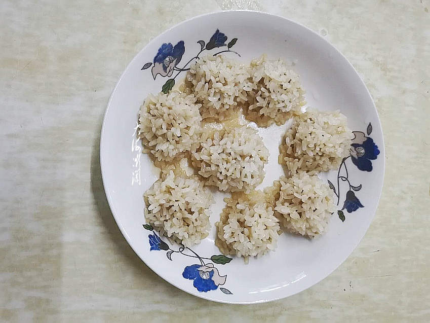 第一道:珍珠丸子,这是孩子们最爱吃的一道菜,中秋节点名要吃的菜,猪肉做成肉馅,团成丸子,江米提前浸泡好,将肉丸子粘上一层浸泡好的江米,然后上屉蒸熟就OK了,口感黏糯香滑,肉馅香而不腻,是孩子们最喜欢的一道菜,当主食吃顶饱又解馋。