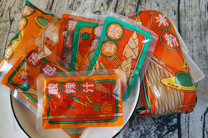 打开螺蛳粉包装,有6个调味包和一包米粉,6个调味包南方人会统统放进碗里,北方人可要注意了,如果不能吃辣,辣椒油包就少放些吧,不然可能会吃不消哈,完全不放就没有酸辣劲爽的味道了。