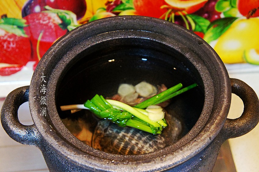 砂锅加入适量多的水,放入冲洗干净的甲鱼,少许加点料酒,加入葱和姜片,大火烧开小火慢炖。