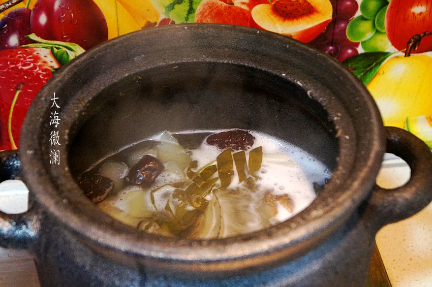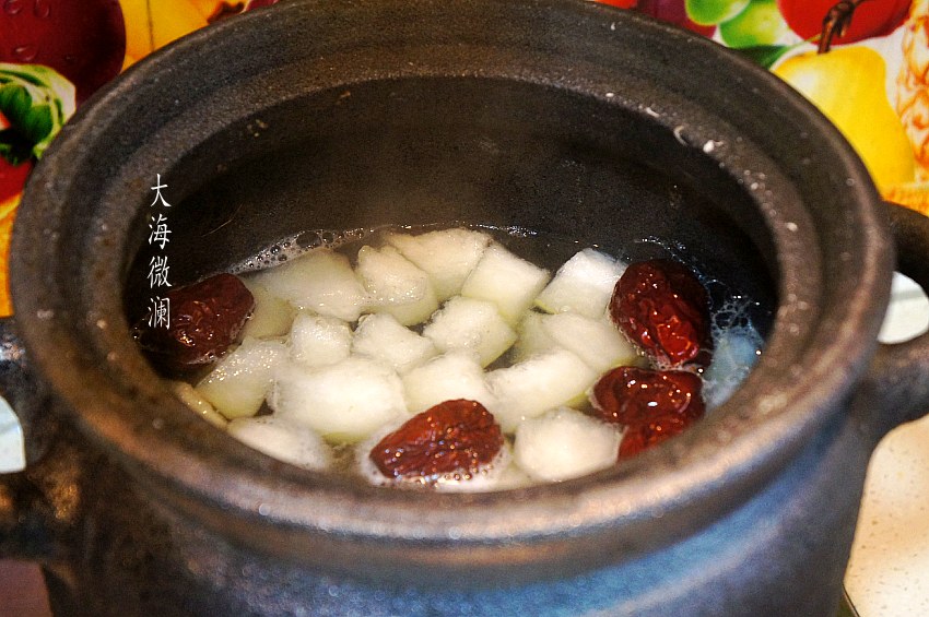 打开锅盖,下入冬瓜和红枣,然后大火烧开,中小火慢炖。