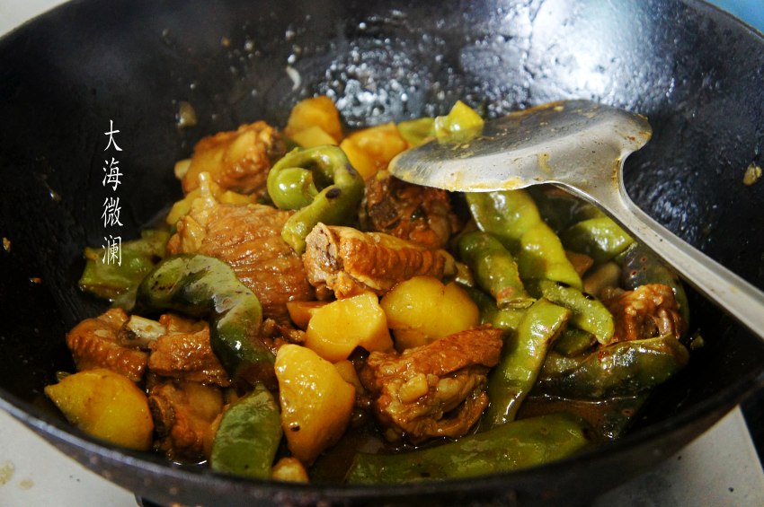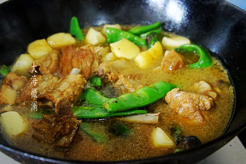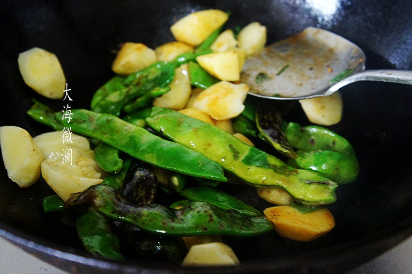 加入适量的水,不要加太多,土豆和豆角都很容易熟,排骨是之前做好的红烧排骨,留出来准备炖豆角吃的。大火烧开,中小火炖熟即可。