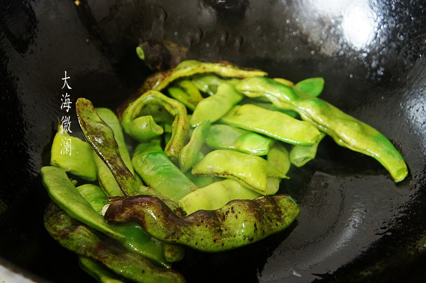 炒锅加入适量的油,爆香花椒粒和葱花,下入豆角翻炒,炒至豆角变成绿色即可。