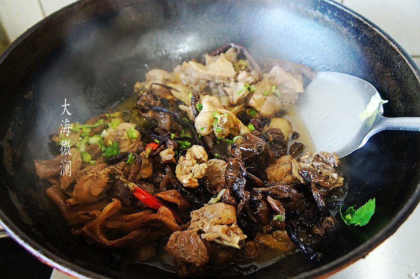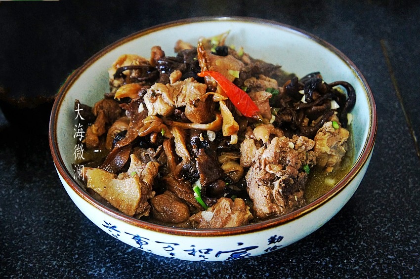 【小鸡炖蘑菇】所需食材:老母鸡半只;榛蘑适量;元蘑少许;盐适量;花椒粒适量;大料1个;肉桂1块;葱适量;姜适量;蒜适量 ;香菜适量;酱油适量;白酒少许。