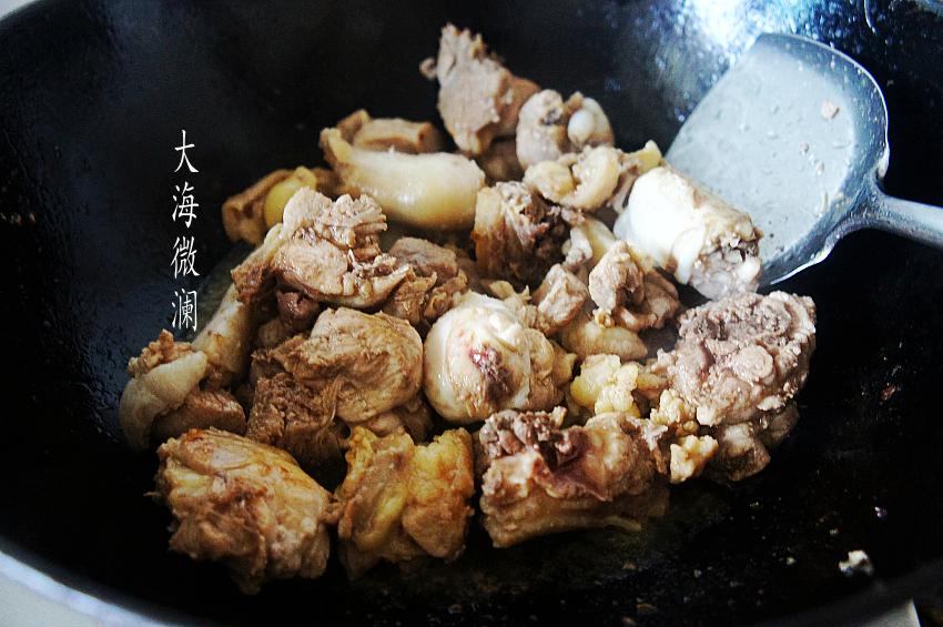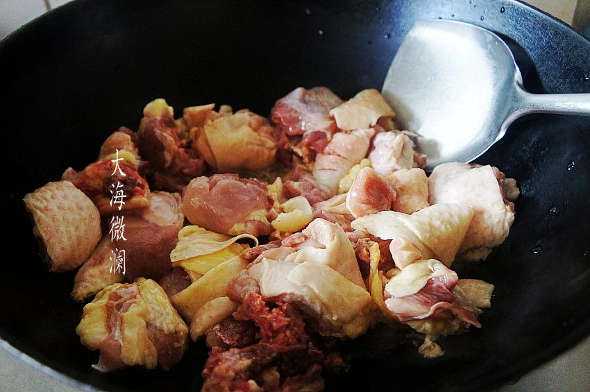 炒至鸡块无水分为止,这样炖出来的小鸡特别香,无需焯水。