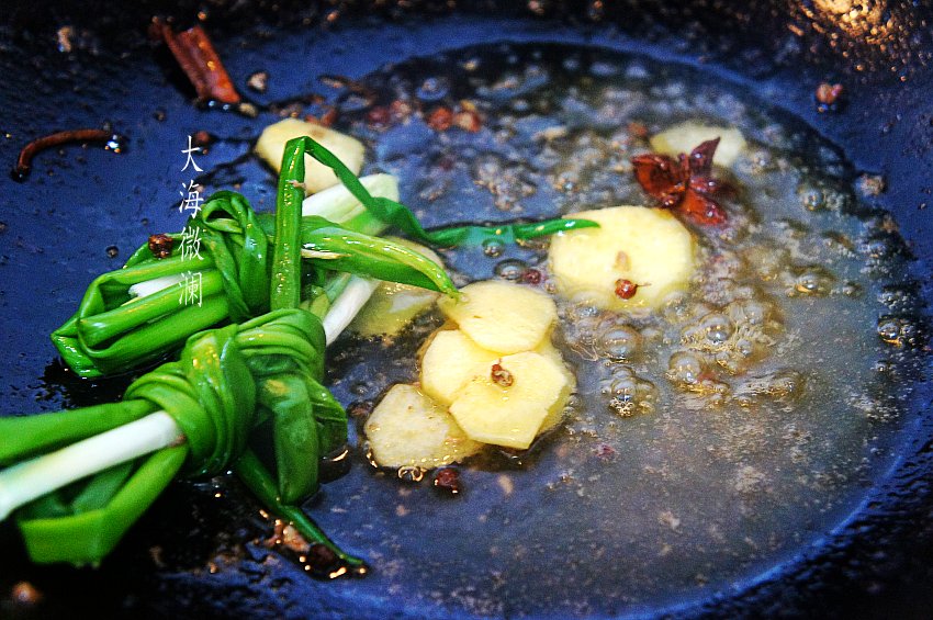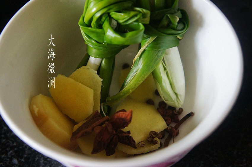 准备两根小葱,去皮洗净卷成卷,姜去皮洗净切片,花椒、大料、肉桂、小米椒等都准备好。调味料随自己喜欢的口味添加,不加也可以,这菜随便一炖就特别香,绝对是一道特色菜。