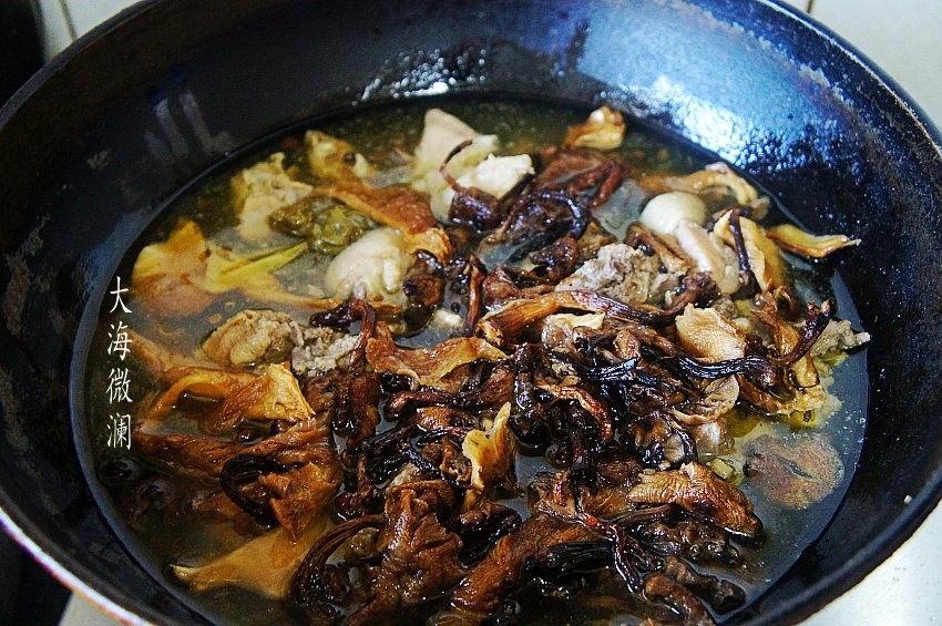 浸泡好的榛蘑清洗干净,浸泡榛蘑的水澄清后可以用来炖鸡,味道特别浓郁。