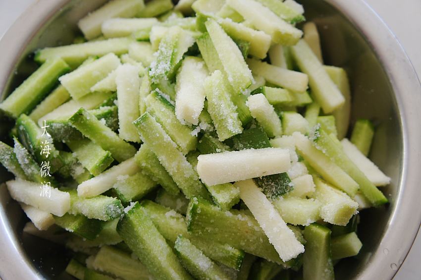 在切好的萝卜条上撒些盐,拌匀,喜欢咸一点的就多加点盐,这个根据个人的口感确定用量哈。