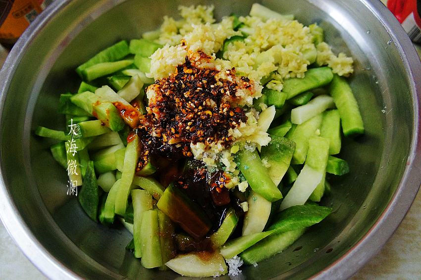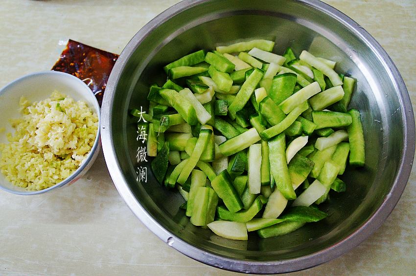 加入适量的盐拌匀,腌制12小时以上,会出很多水,然后捞出萝卜条,攥掉水分,装入网袋中,压上重物,比如坛子灌满水或者用石头压上,压上24小时左右,挤出剩余水分。压后的萝卜条基本不会再出水了。取出压好的萝卜条,大蒜去皮洗净,用夹蒜器夹碎,姜去皮洗净切碎,我用的川味辣椒油是网购阿宽红油面皮里边的辣椒油料包,麻辣味,很香。
