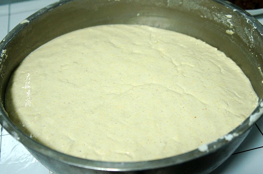 沉淀后的黄米面,倒出上边的清水,加入玉米面粉揉匀,盖上盖子,自然发酵,大约4小时左右就发酵好了,面团不要太干,太干,粘豆包不会太黏糯,也不能太稀,那样包出来的粘豆包都趴下了,像盆中这样刚刚好。