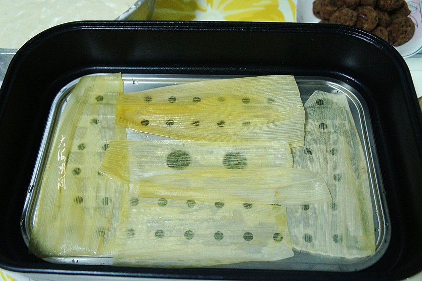 臻米多功能电火锅,一锅多能,涮、煮、蒸、炖样样都行,今天用它来蒸粘豆包。锅中加入适量的水,不要超过限定水位,放上蒸帘,然后铺上一层洗干净的玉米叶子,防止粘连。这锅非常实用,4升黄金容量,蒸一锅真解决问题。