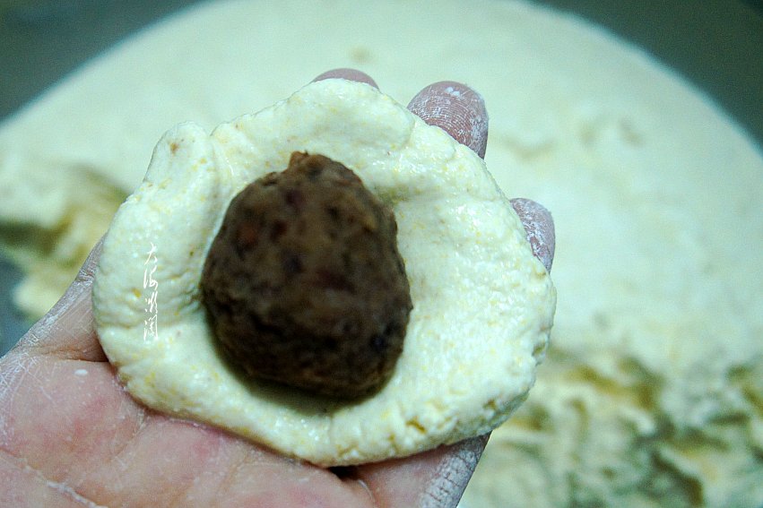 包豆包就简单了,取适量的面团,按扁包上豆馅,团光滑即可上屉。