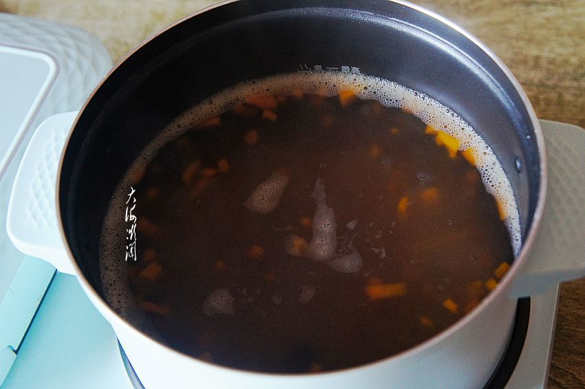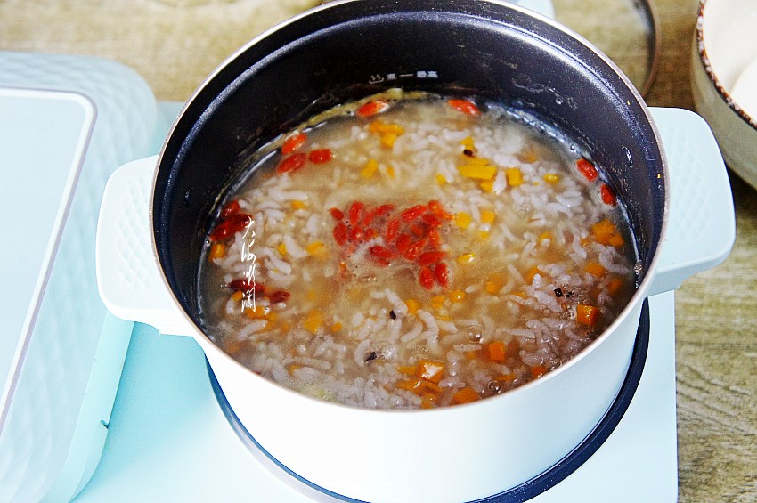 我大约煮了半小时,食材不同熟的时间也有差别。很粘稠,加入洗干净的枸杞子,再煮一分钟关火。