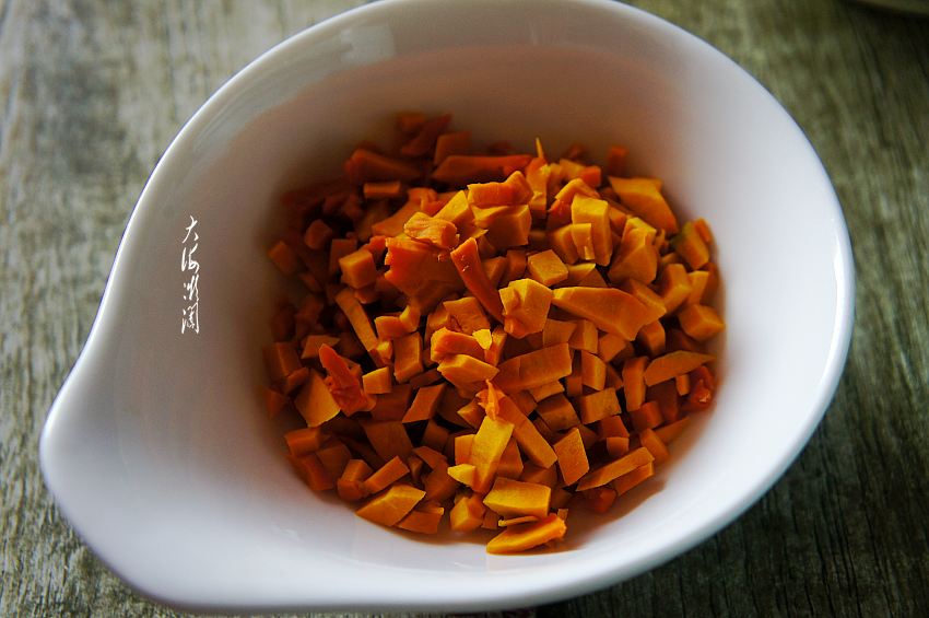 南瓜去皮去瓤,洗净切丁。南瓜是众所周知的美容产品,是女性朋友们的最爱,南瓜中富含的胡萝卜素,可在体内转化成维生素A,有效保护视力,促进骨骼发育,维护皮肤健康,所以中老年人可以多吃一些南瓜。搭配早餐,营养十足,能量满满,还有美容养颜的功效哦!