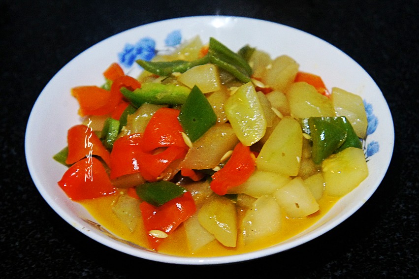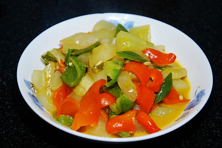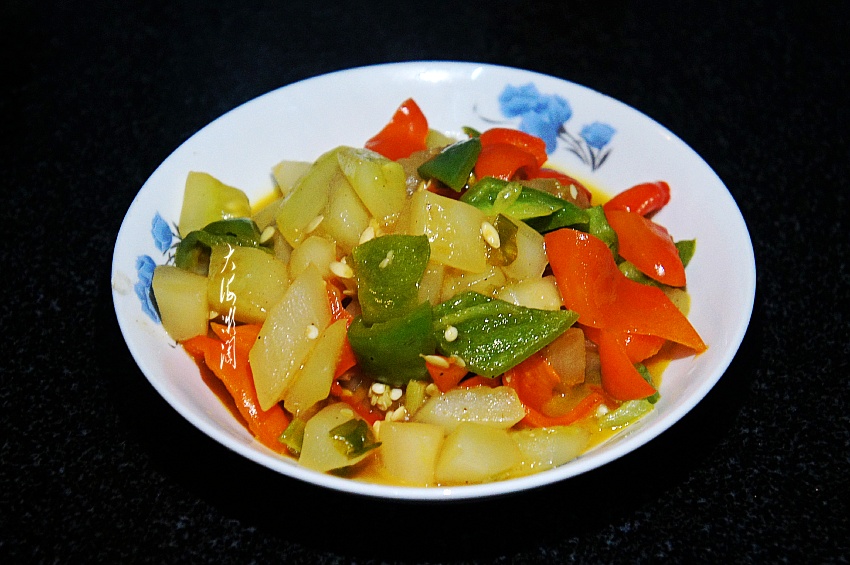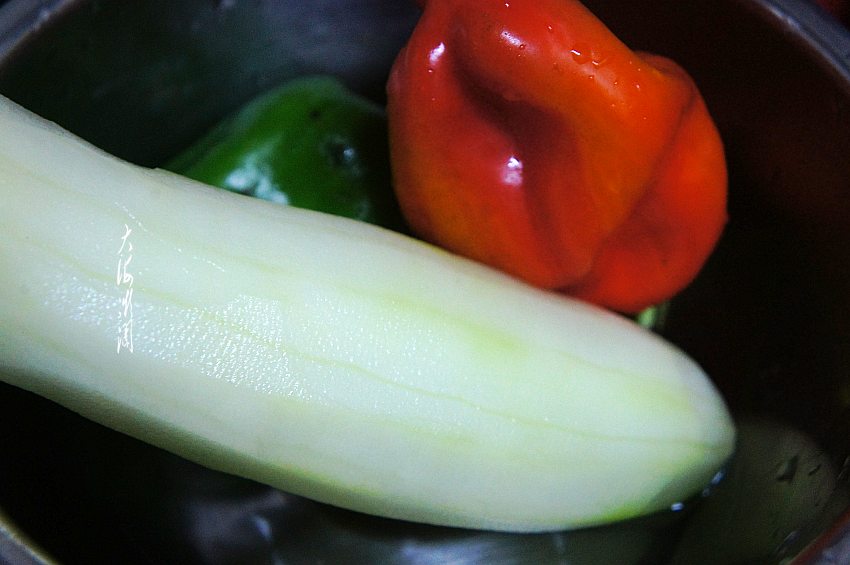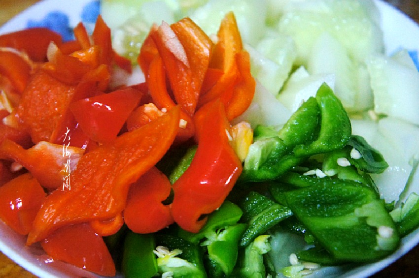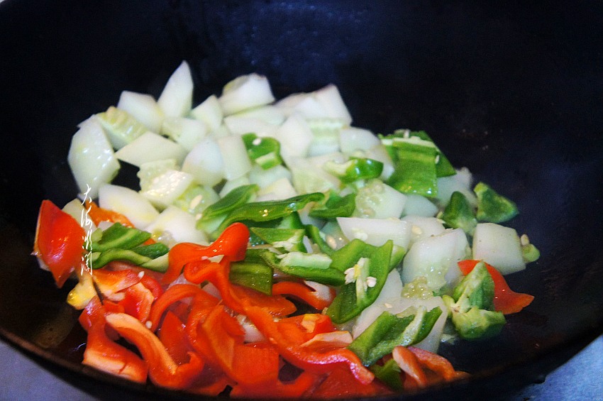 青红椒切块,不要太大,适中就好。老黄瓜切块,注意,这里不是切片,而是切块,切块的口感才爽脆。