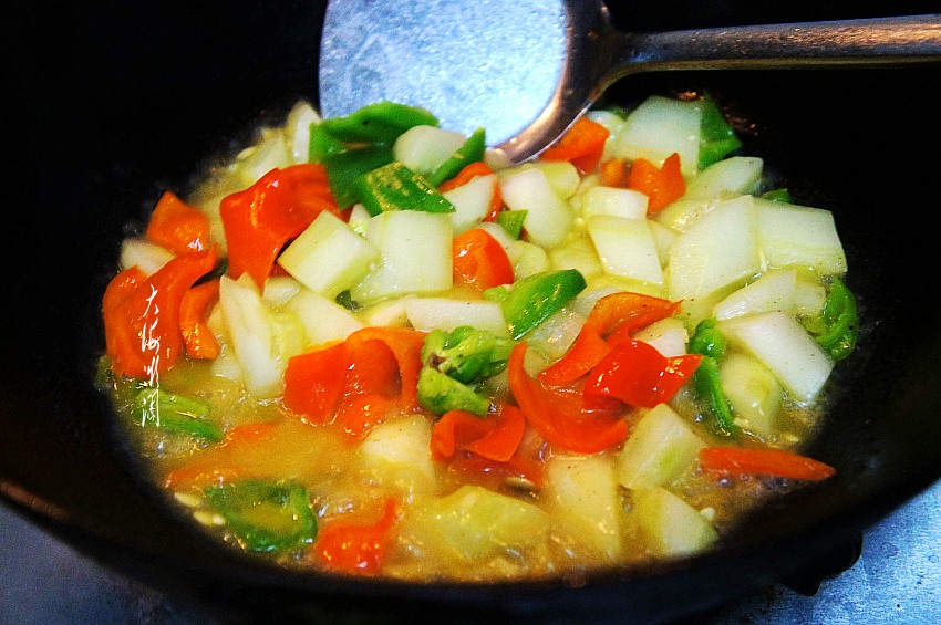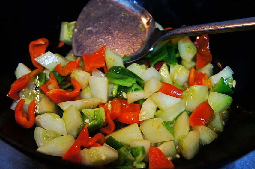 炒至青椒变软,加入少许水,炒一分钟左右,别盖锅盖哈,那样容易把蔬菜焖变色了。