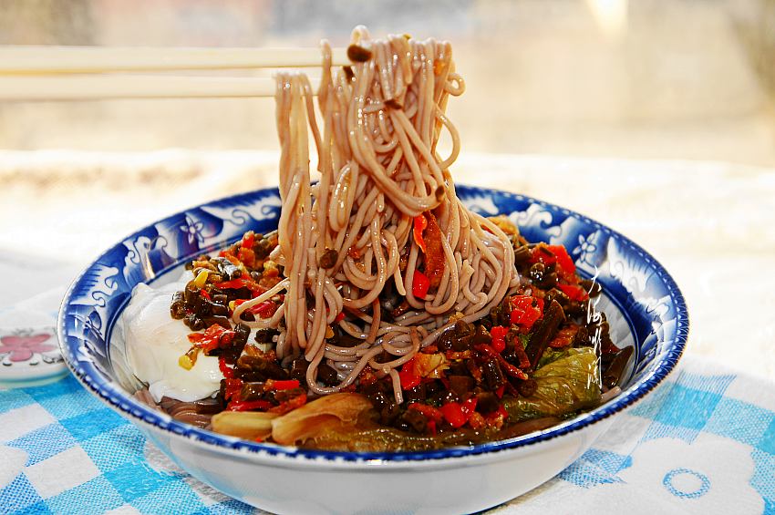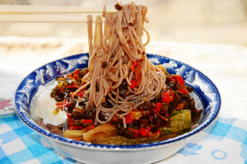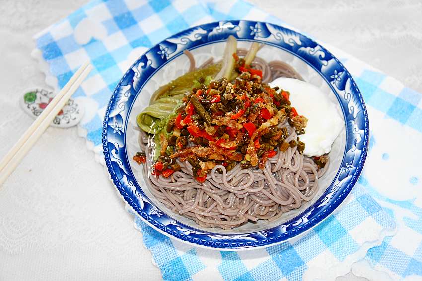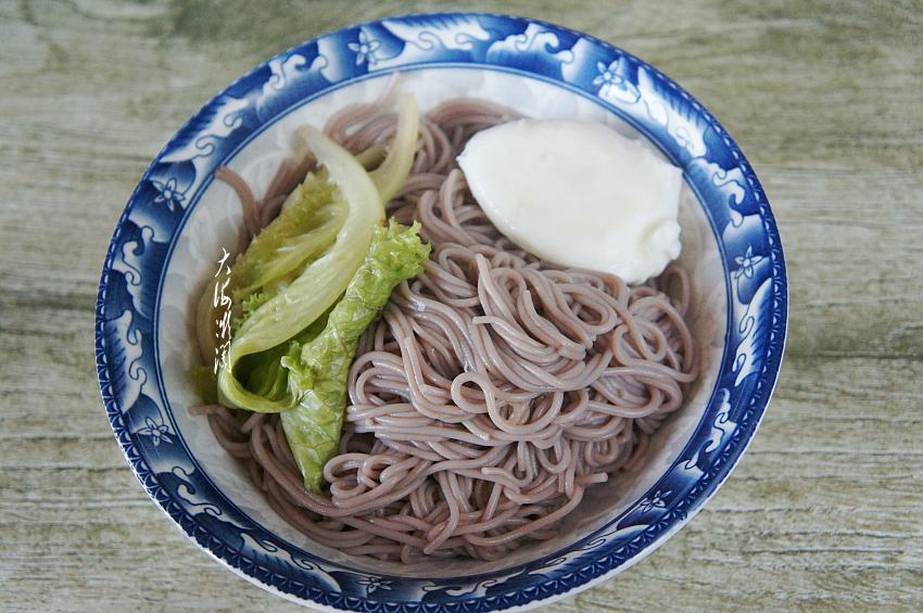 【过水荞麦面】所需食材:荞麦面条100g;鸡蛋1个;生菜叶适量;酸豆角卤适量。