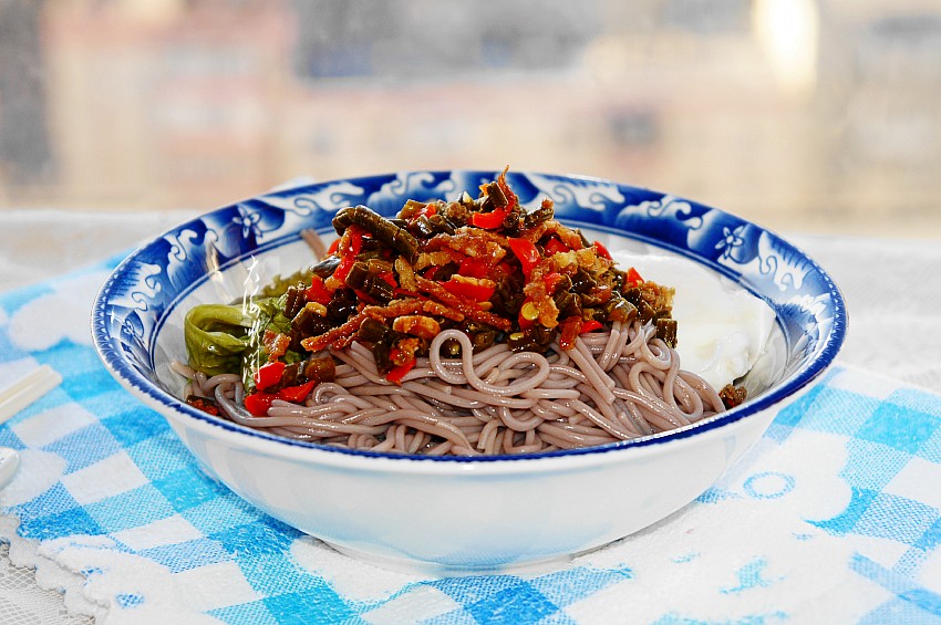 荞麦面条的做法也很多,冬天最适合煮热汤面,荷包一个鸡蛋,加点新鲜的蔬菜,热乎乎的一碗下肚特别舒服。也可以炒面,我家小朋友特喜欢炒面,饭菜一锅出,好吃还有营养。今天我做的是打卤面,因为同事送过来一把酸豆角,于是就馋打卤面了,冬天的打卤面不要过冷水,过温水,面条不凉,还能吃到打卤面的口感,特别爽口开胃。喜欢的朋友不妨试试!