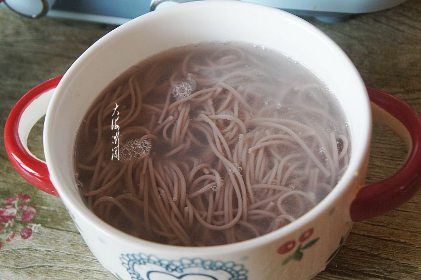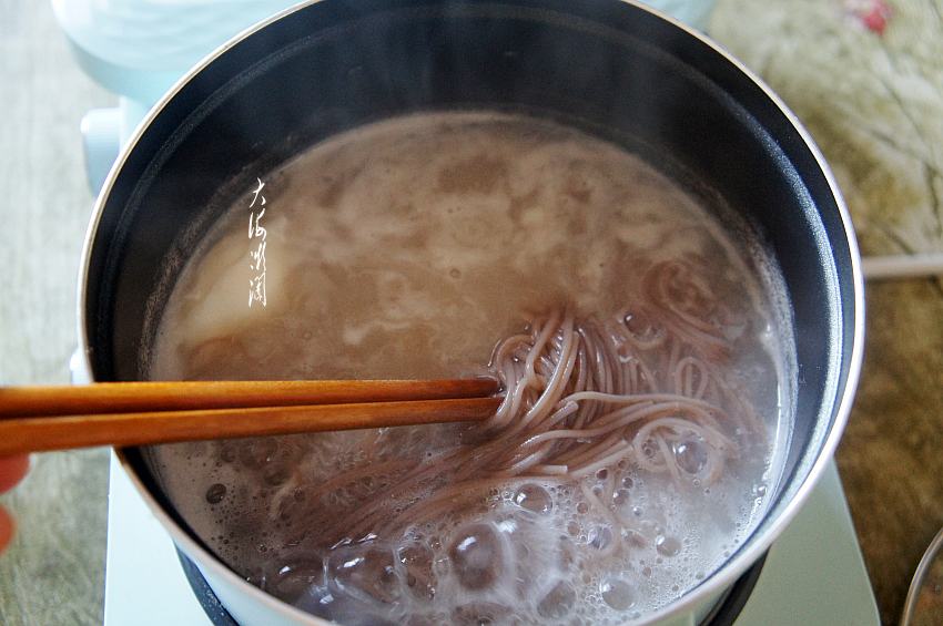 再次打开开关,轻轻滑动鸡蛋,漂浮起来,待水煮开,下入荞麦面,轻轻滑动挂面,防止粘连。