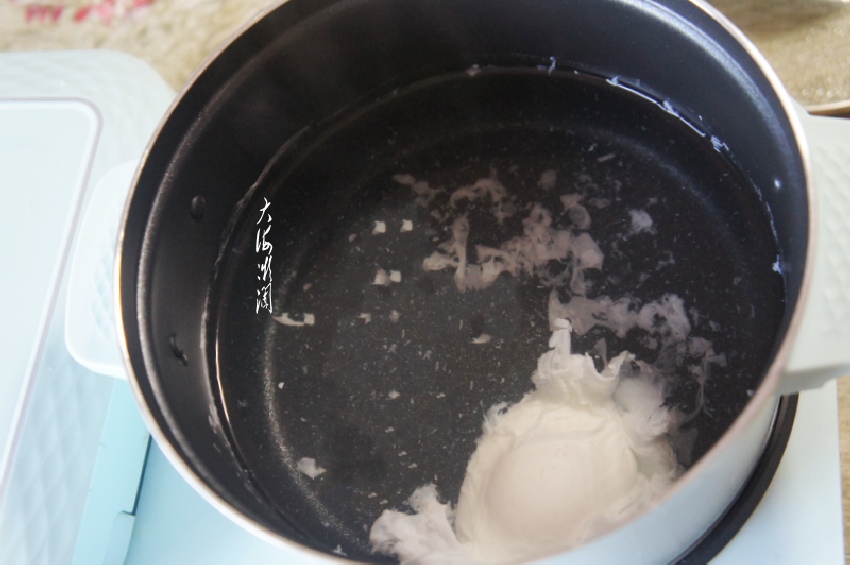 今天用的是三明治机煮锅煮的面,比较简单,不用开火了。锅中加入适量的水,打开开关,大火烧开,水开关火,磕入鸡蛋,盖上锅盖,让鸡蛋在开水中慢慢凝固成形,大约1分钟左右,电煮锅的余热还是比较高的,鸡蛋刚打入锅中还是有一点点飞,不过不是末,直接变成蛋花了,还好凝固成型。