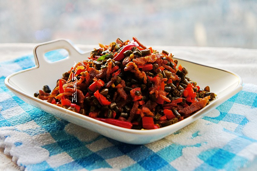 提前做好的酸豆角卤,加点辣椒,酸辣的口感,特别开胃的一道菜,不吃面也是一道很美味的下饭菜。