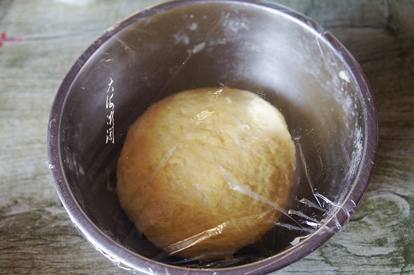 然后揉成面团,抹上一层油,盖上保鲜膜,放在温暖的地方发酵0.5~1小时左右。