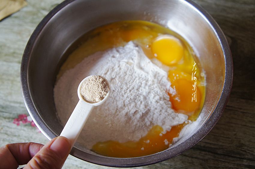 白糖放入面粉中混合,打入鸡蛋,加入牛奶,再放入酵母,搅拌成絮状。