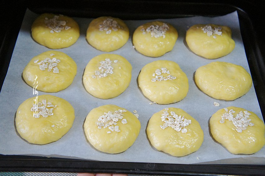 喜欢的上边可以撒点黑芝麻或者撒点麦片,先在小饼上边中间部位少许抹点水,撒上麦片。