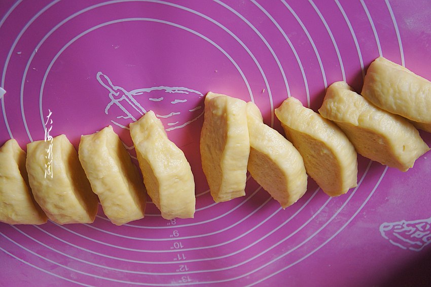 取出面团再揉一揉,表面变得很光滑,然后揉成长条,均匀地分成若干小面剂子,我分成12个,根据烤箱的大小考虑数量。