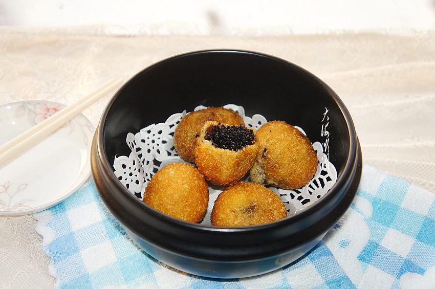 【炸黄米面元宵】所需食材:黄米面团200g;红糖黑芝麻馅适量;植物油适量。