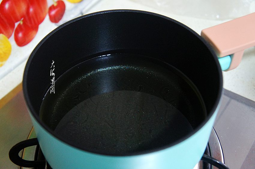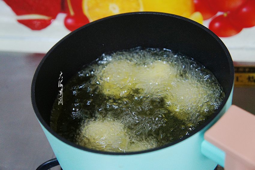 锅中加入适量的油,中小火加热。用不粘锅油炸最好,可以不用放很多油,这个小锅很实用,比较深,用来炸元宵不会往外溅油。