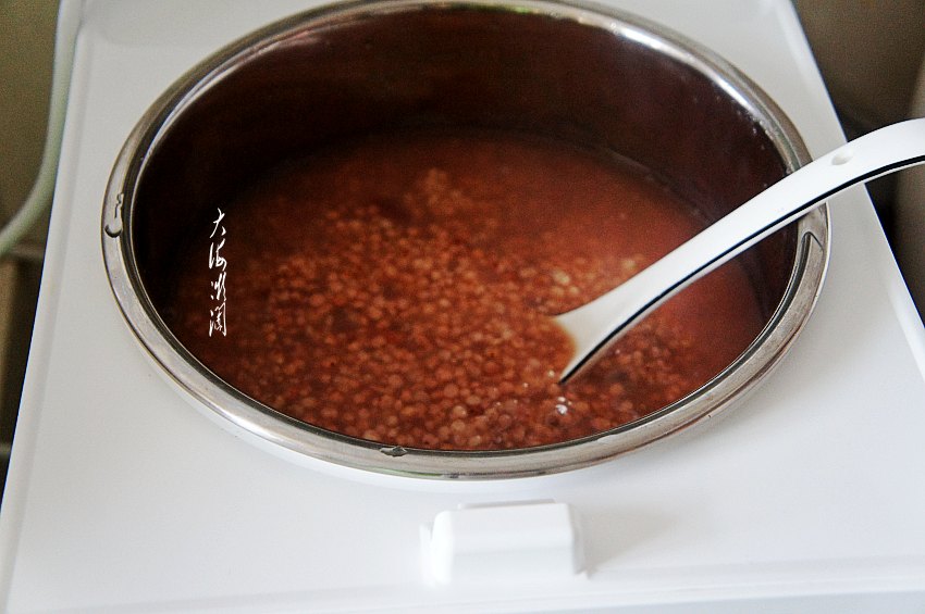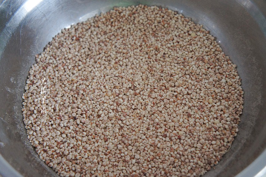 高粱米1碗,这个量做晚餐主食基本是2~3人份可以吃一顿。高粱米淘洗干净,多淘几遍看上去就白了,这是自家种植的高粱米,磨得不够狠,还能看到红色皮的痕迹,网上卖的的白高粱米很白,看不到红色。