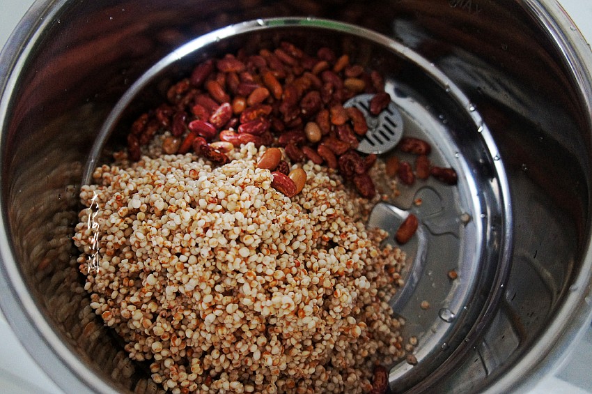 把淘洗干净的高粱米和芸豆放入电饭煲内胆中,现在能看出来了吧,为什么这种高粱米被称作白高粱米,淘洗过后,米粒就白很多。