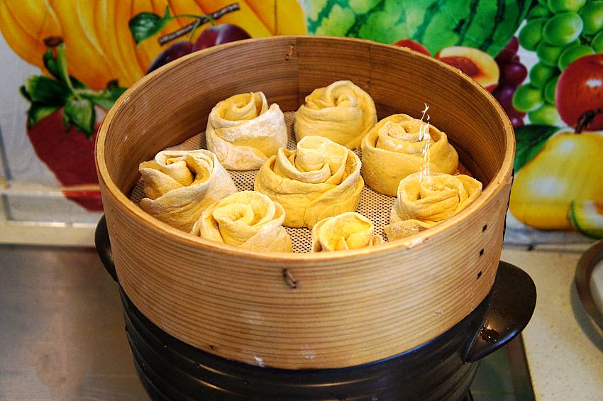 做好的花卷码入蒸屉,锅中加入适量的水,冷水上屉蒸,盖上锅盖,大火烧开,蒸15分钟。
