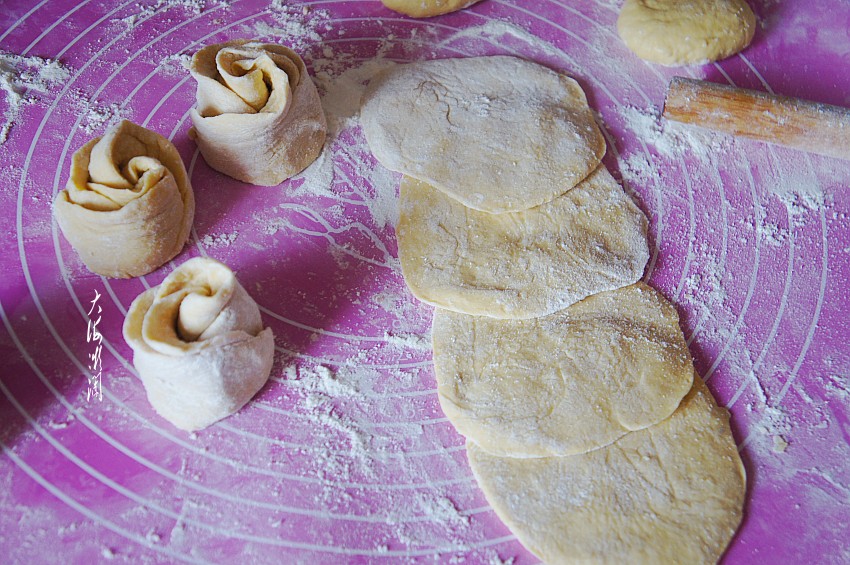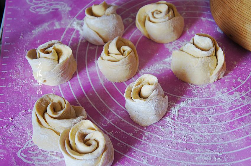 码好的小饼从一边卷起来,卷至另一边全部卷好,然后从中间切开,就是两个玫瑰花卷了。依此类推,完成所有的花卷制作。