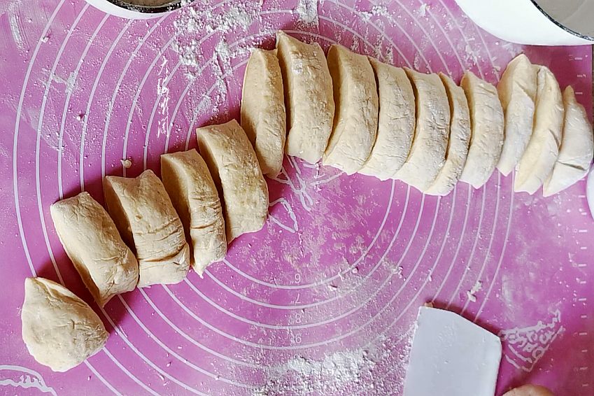 饧好的面团揉成长条,均匀分成16个小面剂子。