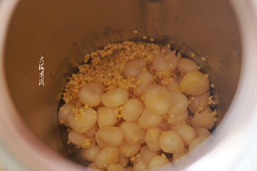 准备食材,今天用的是迷你轻食杯,容量小,食材相对少一些,准备小米、玉米粒和枸杞子,喜欢甜口的,可以加点一冰糖调理口味。
