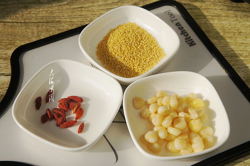 【枸杞玉米小米糊】所需食材:小米适量;枸杞子适量;嫩玉米粒适量。