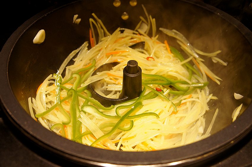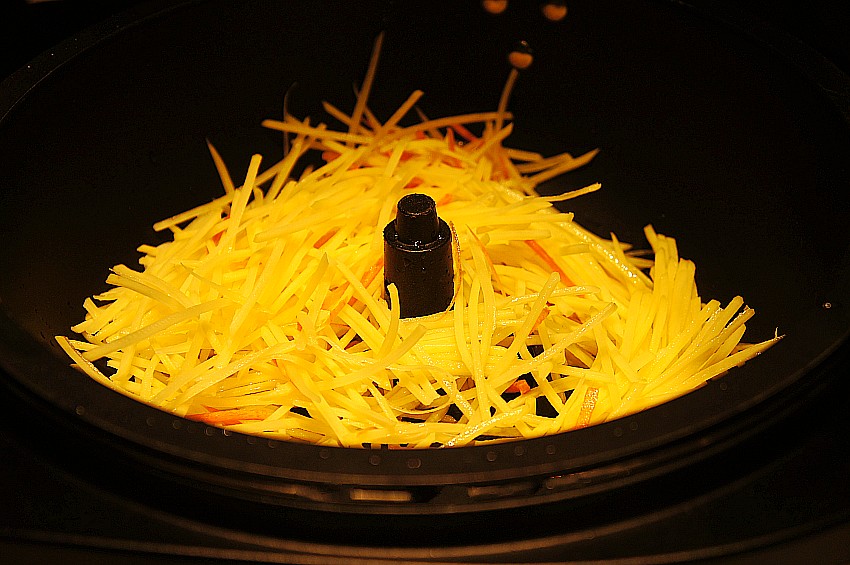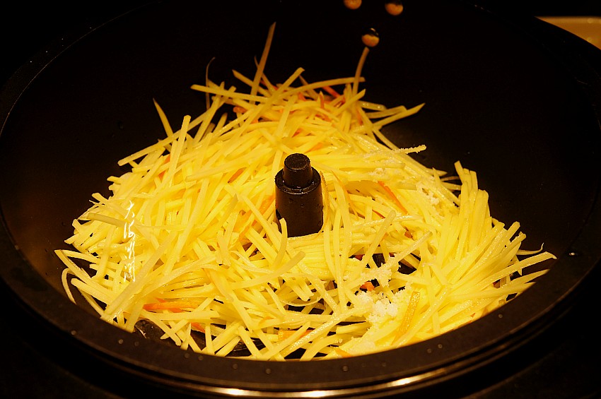 打开多功能炒菜机,滴少许色拉油,下入蒜片、土豆丝、胡萝卜丝。