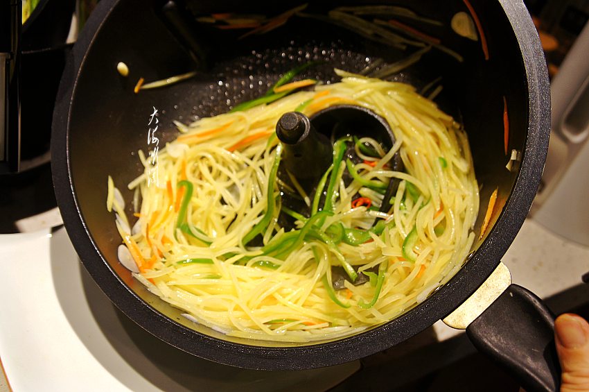 做法及步骤:土豆去皮洗净,整个土豆放进洗菜机清洗5~8分钟左右,然后取出再过冷水清洗干净,用擦丝器将土豆擦丝。这样处理过的土豆丝,放很久也不氧化变色。