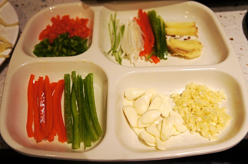 大蒜去皮洗净,青椒和胡萝卜同样清洗干净,和土豆同时放进洗菜机清洗后取出,再冷水清洗干净,青、胡萝卜切丝,大蒜切片。