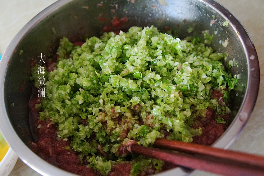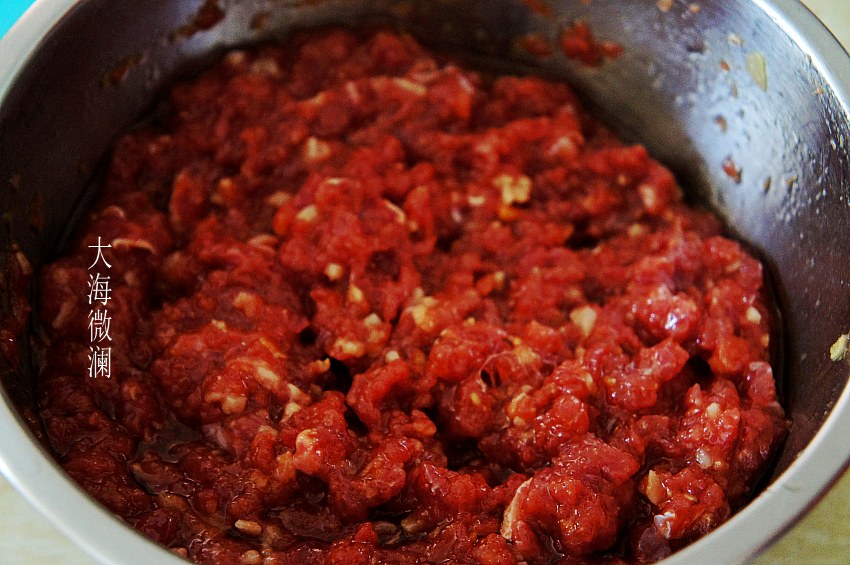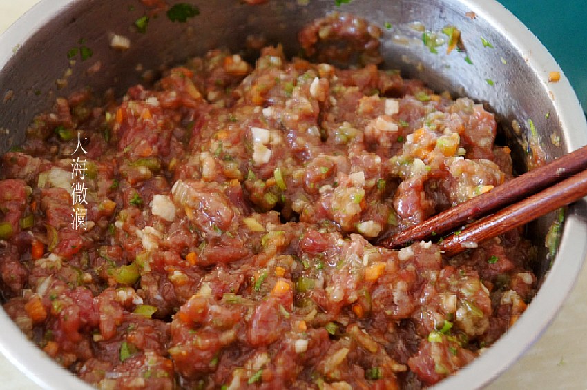 拌牛肉馅:在肉馅中加入适量的盐搅拌均匀,很多人都是后加盐,其实先加盐可以起到杀菌的作用。再加入白糖、白胡椒粉、五香粉、生抽、料酒、蚝油、沿一个方向充分搅拌均匀;然后分多次加入老汤,继续沿一个方向搅拌上劲,至老汤完全融入肉馅里,让肉馅吸满汤汁,最后加入适量的油继续沿一个方向搅拌上劲,最后加油的目的是锁住肉馅中吸收的汤汁,然后放入冰箱冷藏。
