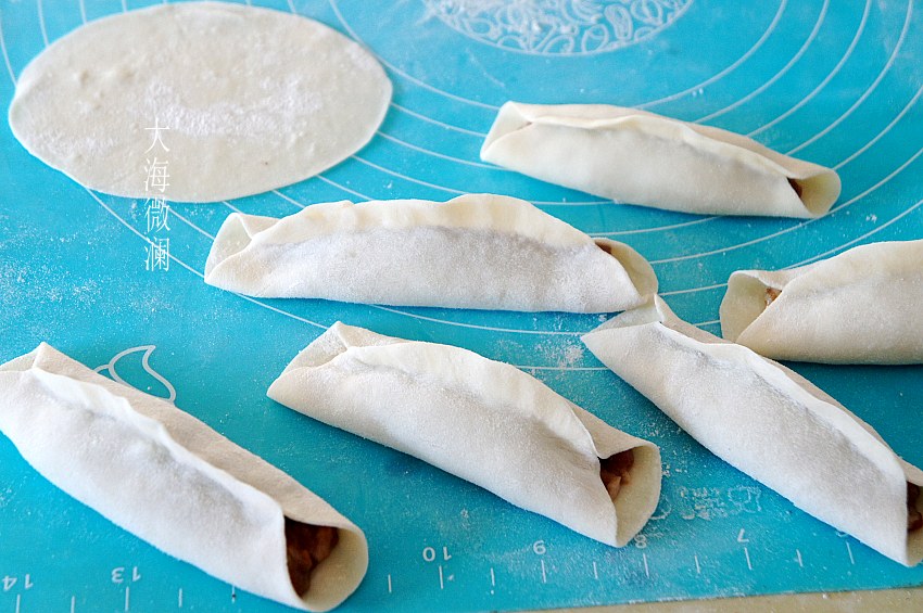 将饧好的面团揉成长条,均匀的分成若干份,擀成饼,包上馅,可以包成饺子,完整捏边,也可以包成锅烙,两边留口,烙的时候那味道才香呢。